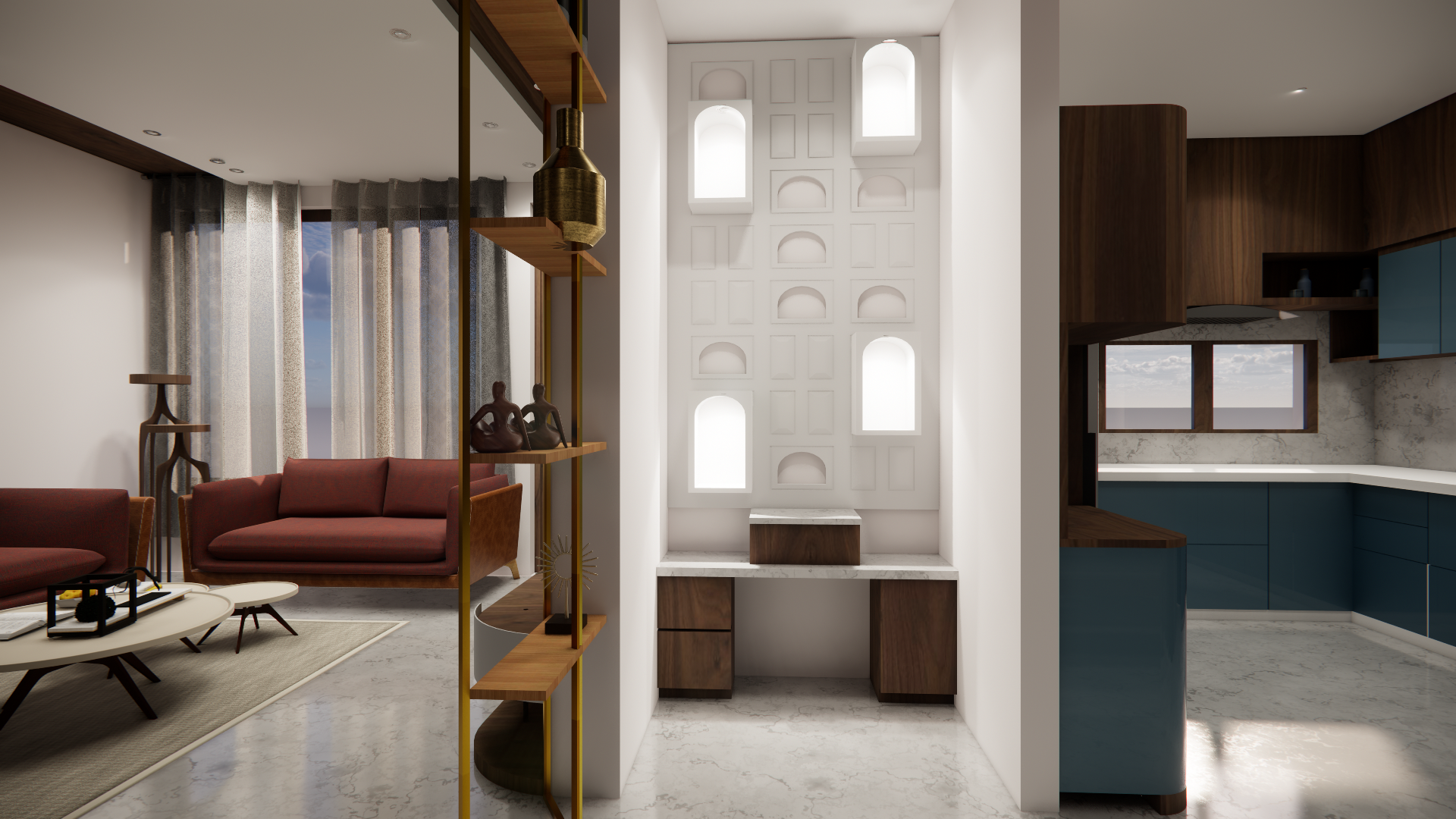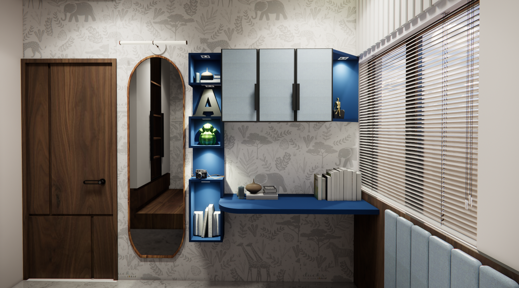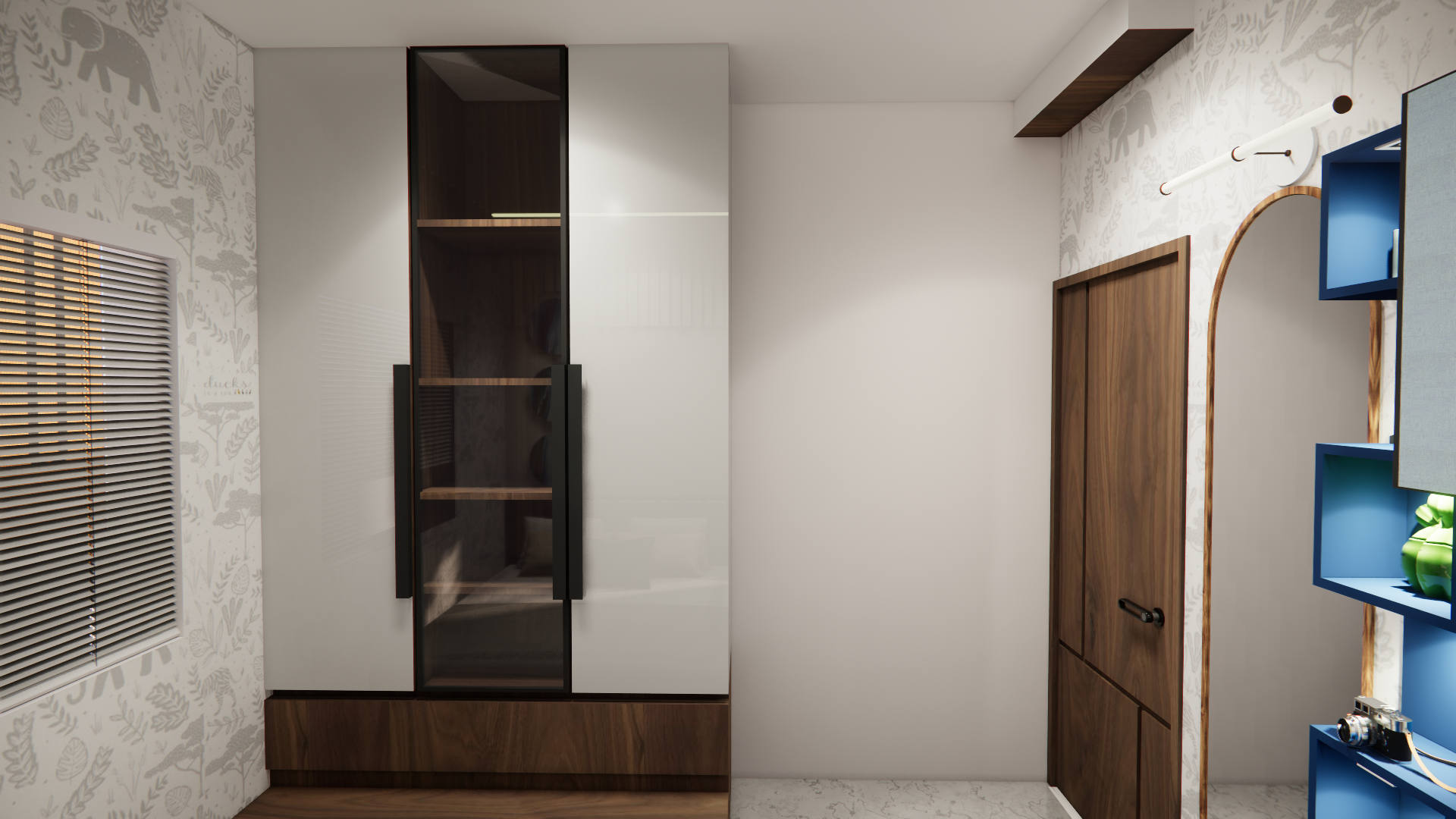 This house is a seamless blend of client specifications and our design expertise, carefully crafted to reflect a harmonious balance of functionality and aesthetics. The design minimizes panelling work, focusing on clean, refined finishes that still create a sense of completeness in each room. Subtle wallpapers add texture and character, while the minimal use of panelling—highlighted by the elegant beading patti details—creates a sophisticated look without overwhelming the space. The wardrobe doors, crafted with a combination of profile shutters and laminate finishes, provide a contemporary yet timeless touch. One of the standout features of the house is a beautifully designed mandir, enclosed with a glass door that adds both sanctity and transparency, offering a serene focal point within the home. Every element of the design works in tandem, providing a functional living space that is both visually appealing and purposefully designed..